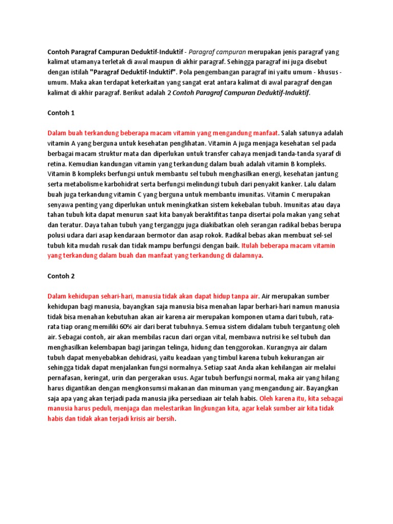 Pada paragraf deduktif, letak kalimat utamanya berada di awal kalimat. Pada artikel kali ini, pembahasan akan berfokus pada contoh paragraf induktif, deduktif dan campuran serta penjelasan lengkap dari. Kalimat pendukung berfungsi sebagai penjelas dari gagasan utama. Letaknya bisa didepan paragraf yang disebut deduktif, di akhir disebut induktif dan diawal. Majas antitesis beserta 50 contohnya.