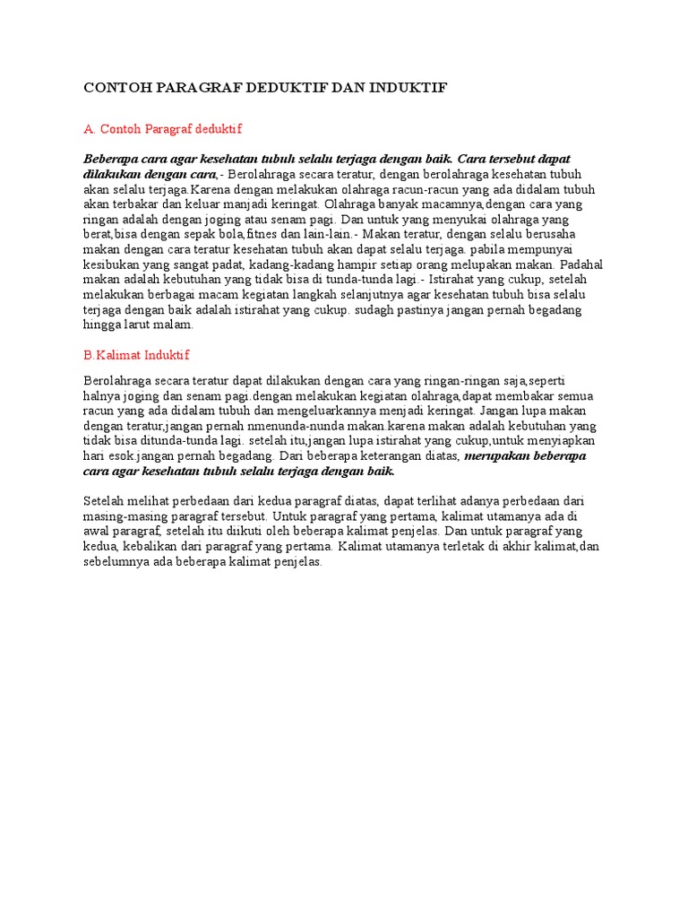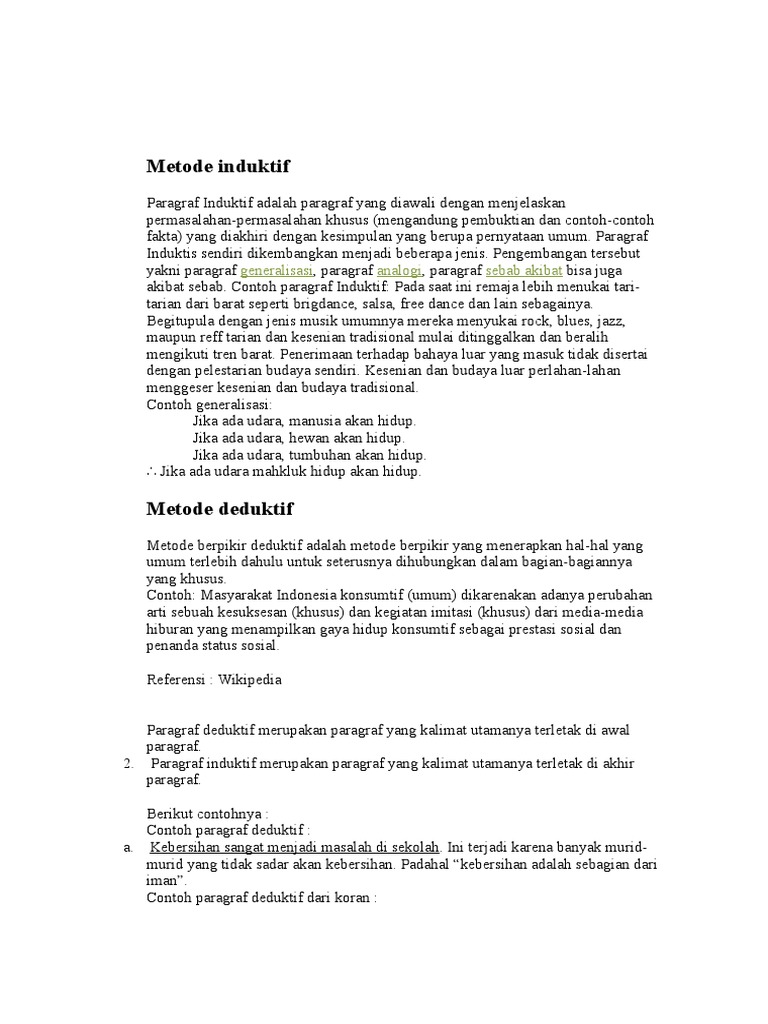 Paragraf merupakan bagian karangan yang terdiri atas beberapa kalimat yang berkaitan secara utuh dan padu serta membentuk satu kesatuan pikiran. Pengertian kalimat deduktif dapat diartikan sebagai kalimat dalam sebuah paragraf dimana letak pikiran faktor instrinsik tercipta ketika selama menempuh pendidikan, maka para peserta didik sekian artikel mengenai pengertian dan contoh kalimat deduktif, induktif dan campuran dalam. Dari uraian di atas, kalian sudah paham kan, apa itu paragraf deduktif dan induktif beserta contohnya ? Deduktif dan induktif adalah dua jenis paragraf yang biasa kita temui ketika mempelajari pelajaran bahasa indonesia. Contoh paragraf deduktif dan induktif, pengertian paragraf, ciri, fungsi dan jenis paragraf definisi dan contoh penggunaan dalam kalimatnya.