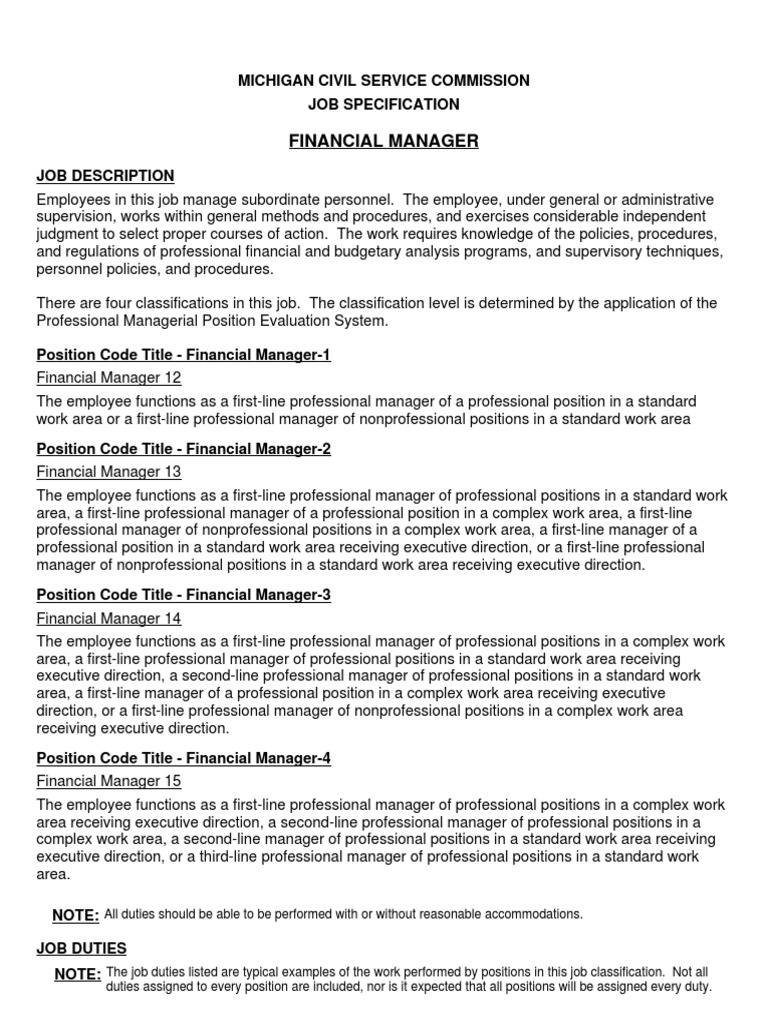 Financial Manager Job Description And Specification : Peterborough Adult Learning Service City College Peterborough Finance Manager Job Description Pdf Free Download / With millions of people searching for jobs on indeed each month, a great job description can help you attract the.. · assisting the financial controller in her/his strategic support to management and lay committees and in provision of financial information to those groups. With millions of people searching for jobs on indeed each month, a great job description can help you attract the. Under the limited supervision of the chief financial officer, a financial manager is responsible for the adoption, utilization, and optimization of financial & business systems. List of main task 3. Help management make financial decisions.